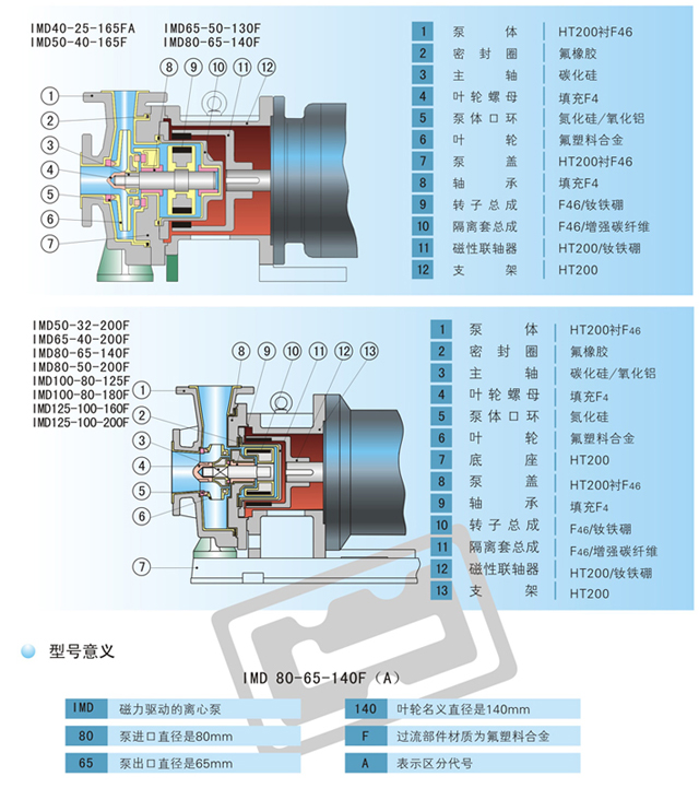 IMD系列磁力泵,流量:1~160m3/h;楊程17~62m,適用于輸送強(qiáng)腐蝕,易燃、易爆、有毒、易揮發(fā)的化學(xué)介質(zhì)。