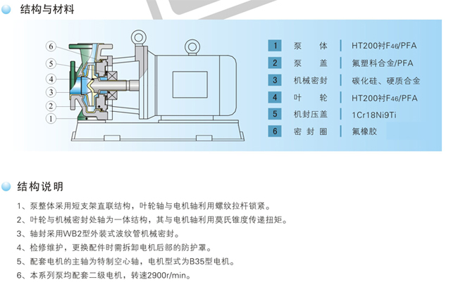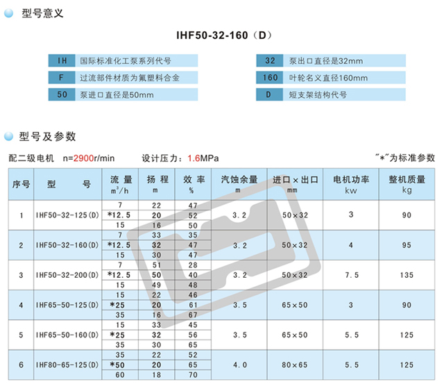 IHF(D)型離心泵是IHF型離心泵的派生產(chǎn)品,是為滿足IHF離心泵性能要求同時受工作場地限制而研制的產(chǎn)品。所有過流部件均采用氟塑料或氟塑料合金制造,耐腐蝕范圍廣;基體采用金屬制造,承壓能力強(qiáng);軸封采用先進(jìn)的WB2型外裝式波紋管機(jī)械密封,密封性能可靠;采用短支架直連結(jié)構(gòu),葉輪軸與電機(jī)軸采用可靠的莫氏錐度傳遞扭矩,泵機(jī)占地面積小。