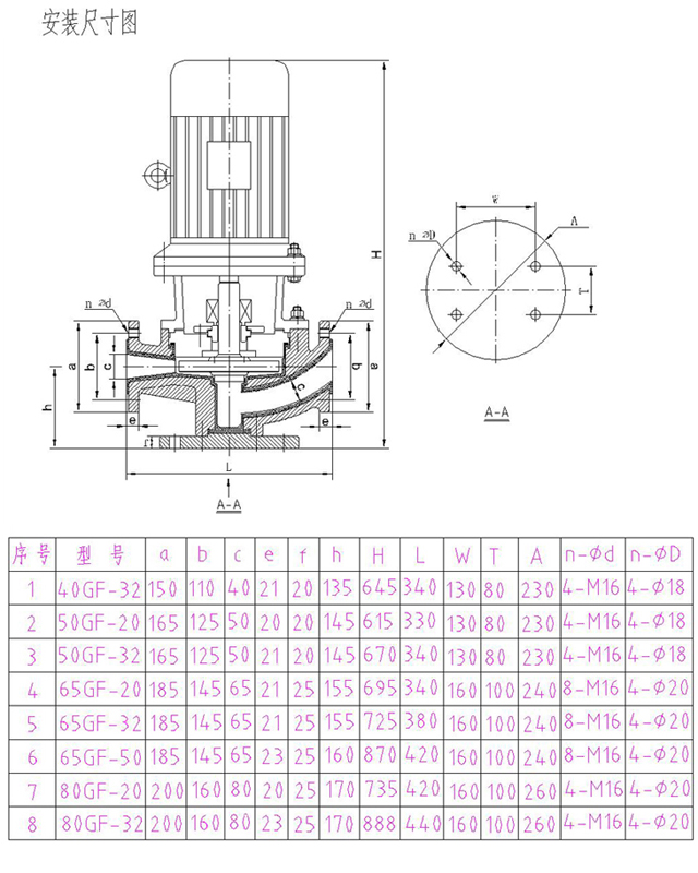 1、GF系列氟塑料管道泵為立式結構,進出口口徑相同,且位于同一中心線上;